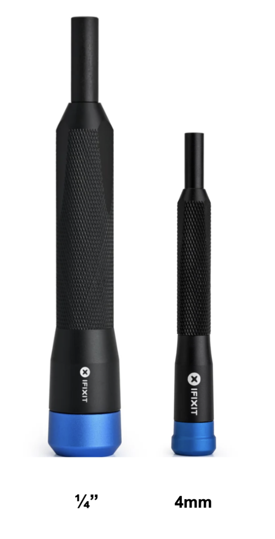 - The 4 mm Precision Bit Driver is the smaller driver with a ridge on the blue cap. Its cap can sometimes be reattached using the guide above.